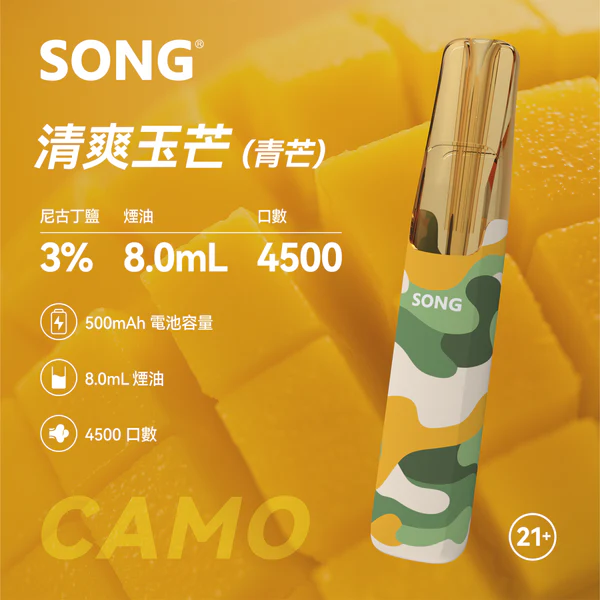 这款崧一次性电子烟以鸭嘴为灵感,凭借其独特的外观和绝佳的口感,迅速在市场中崭露头角。崧鸭嘴系列整体以缤纷的迷彩色为基调,流线型机身搭配哑光质感,贴合唇部曲线,被用户称为“雾化器界的保时捷”。其鸭嘴状吸嘴不仅增加了产品的辨识度,还提升了使用的趣味性。透明外壳设计让烟油余量一目了然,整体质感良好,细节处理到位,无论是日常使用还是外出携带,都能成为一种时尚配件,让用户在使用过程中感受到满满的仪式感。该系列香气轻柔而纯净,没有丝毫的杂味,带着自然的清新感,烟雾十分顺滑,击喉感适中,既不会让新手呛咳,也能让老烟民找到熟悉的满足感。Song崧鸭嘴兽配备了8ml的烟油,官方标注可支持4500口的使用。实际使用中也表现出了较长的续航能力,满足了用户长时间使用的需求。它可以吸食4500口,相比其他同类产品,更加耐用且经济实惠。这种超长续航能力,让你无论是长途旅行还是日常使用,都能享受到持续的满足感。